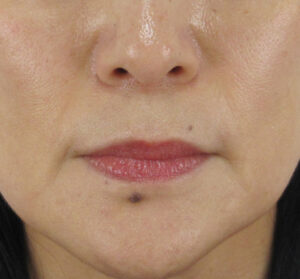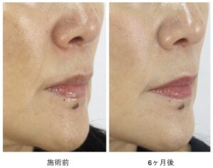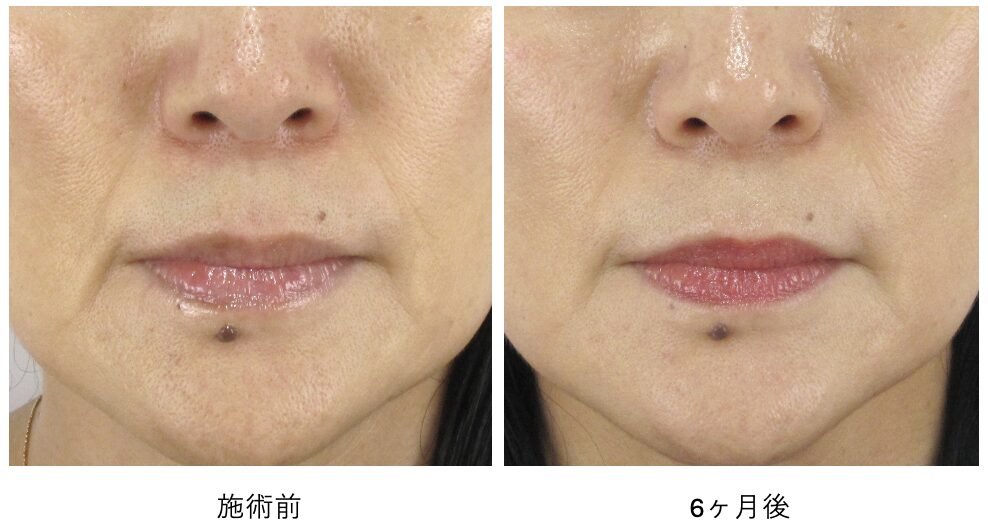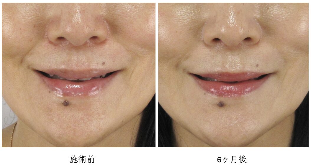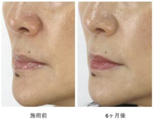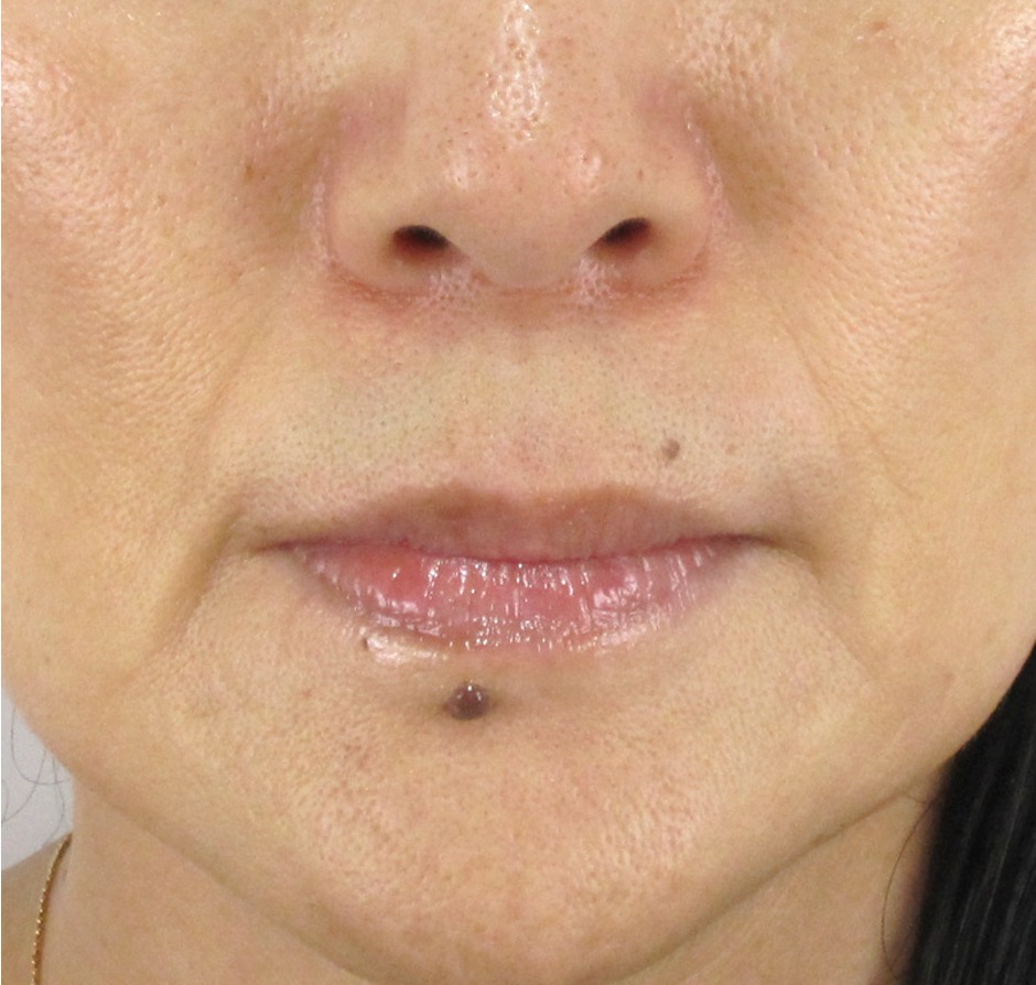 もともとほうれい線の溝そのものはとても浅いため、真顔の状態での変化はマイルドですが、それでも口元のハリ感が向上し、細かいしわが目立ちにくく改善しているのがわかります。