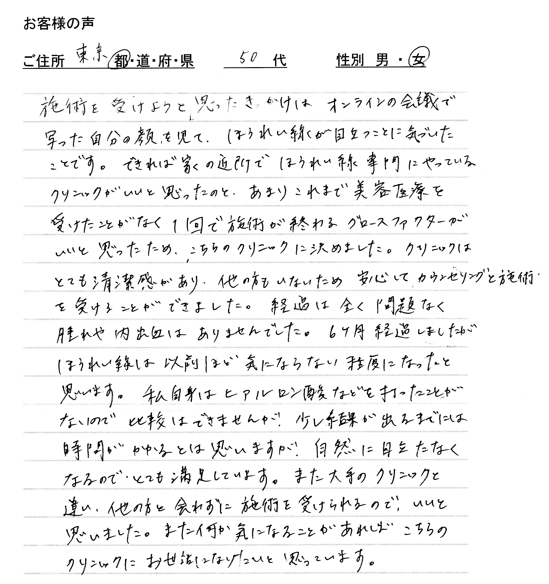 美容医療は初めての方で、最近になって写真やオンライン会議などの画面に映った際に、ほうれい線が目立って見えることが特に気になっていたそうです。