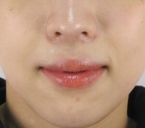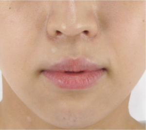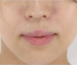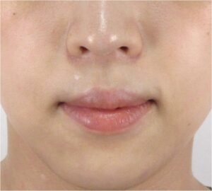 診察上、ほうれい線としての明確な「溝」や「しわ」は現時点ではほとんど見受けられませんでしたが、笑ったときに口角の横のしわが目立つ様子がみられました。