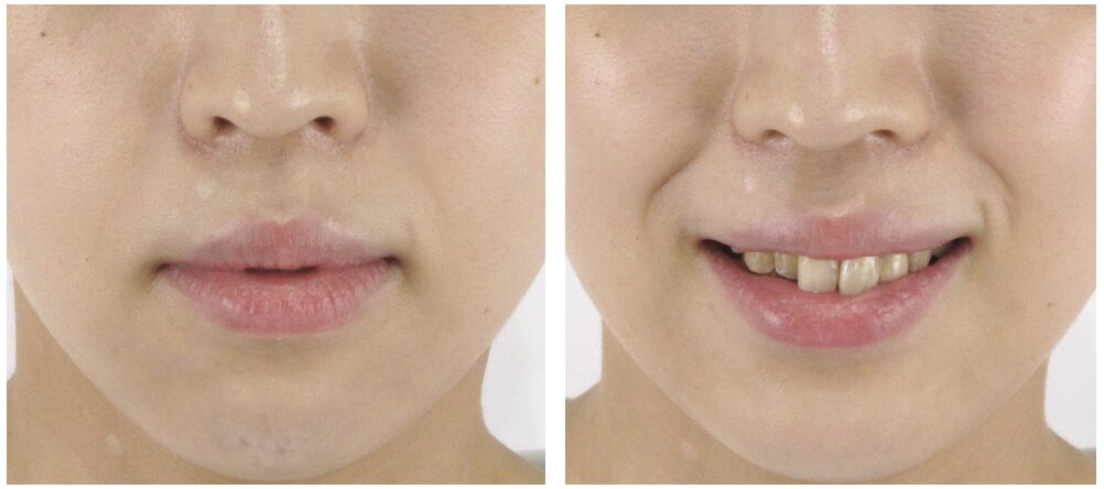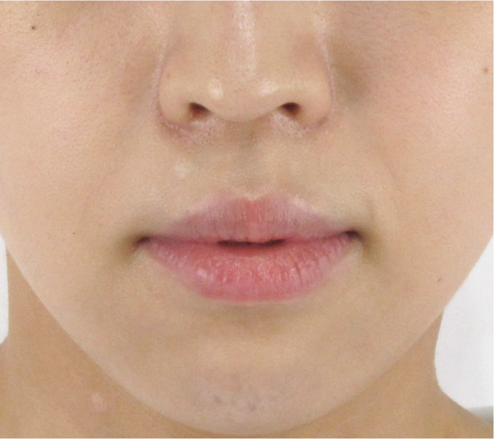 診察上、ほうれい線としての明確な「溝」や「しわ」は現時点ではほとんど見受けられませんでしたが、笑ったときに口角の横のしわが目立つ様子がみられました。