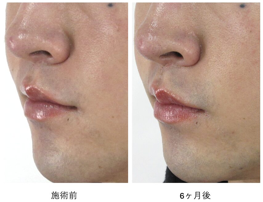 斜めからの角度でも大きな変化としては捉えにくいものの、鼻の横のくぼみがやや底上げされ、影が目立ちにくくなっている変化がわかります。