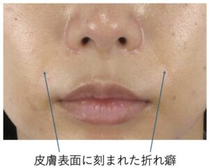 ほうれい線の構造上の「溝」や「影」はまだほとんど目立ちませんが、皮膚の表面に折れ癖が付き始めているのがわかります。
