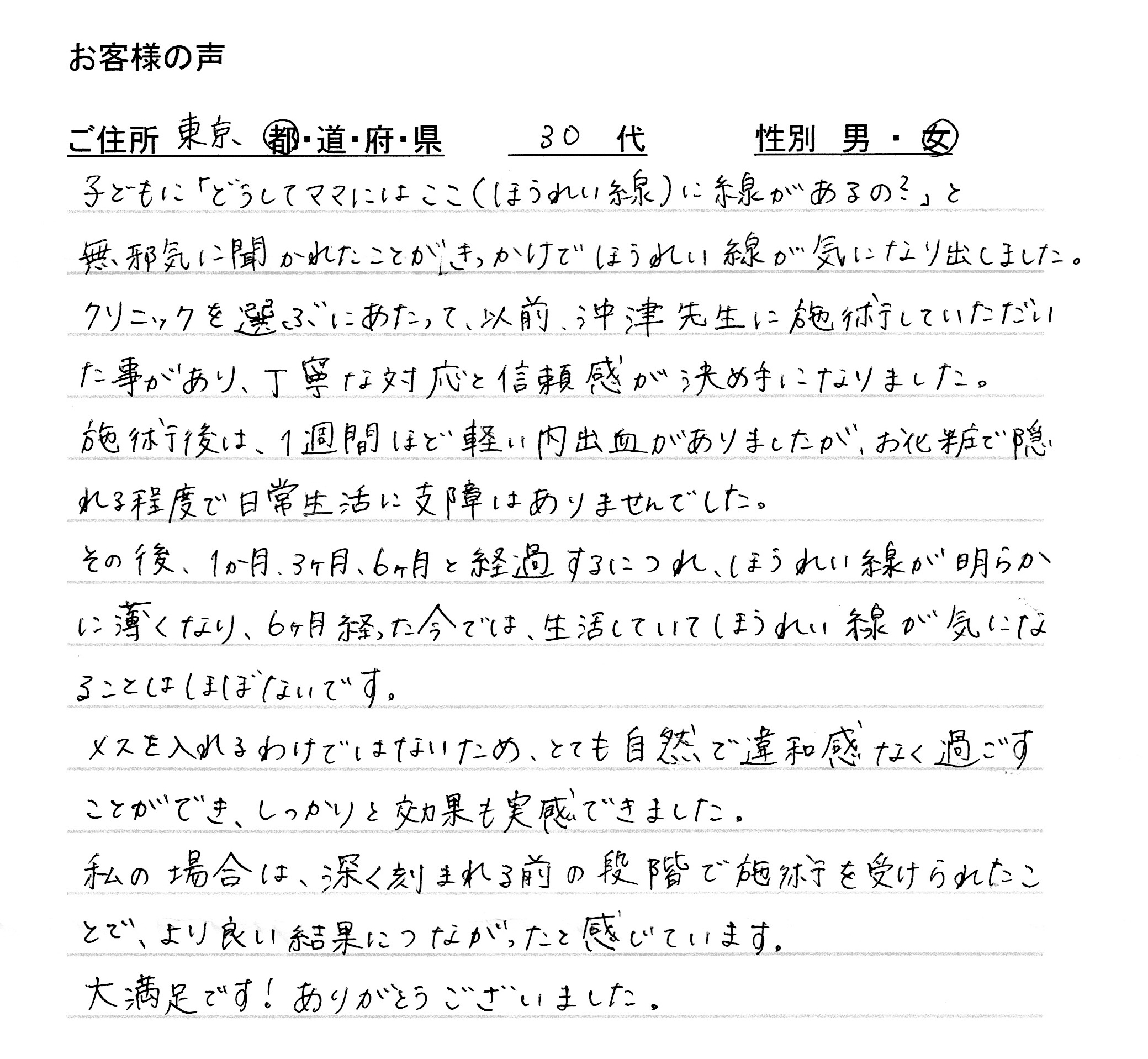 ご本人様からも「ほうれい線がほとんど消えて今では気になることもなくなりました。受けてよかったです。」と嬉しいお言葉をいただき、早速ご友人の方を当院にご紹介してくださいました。