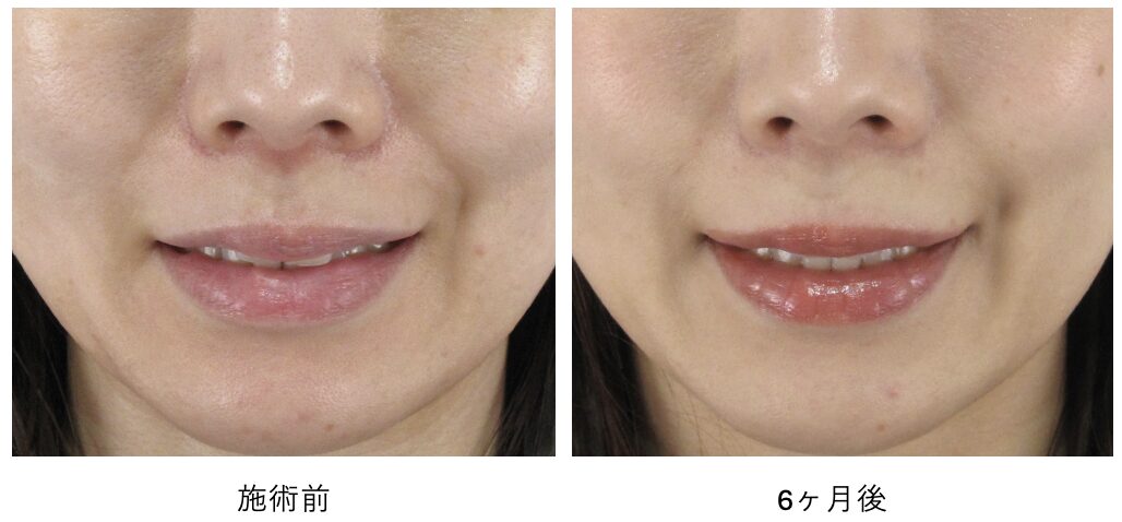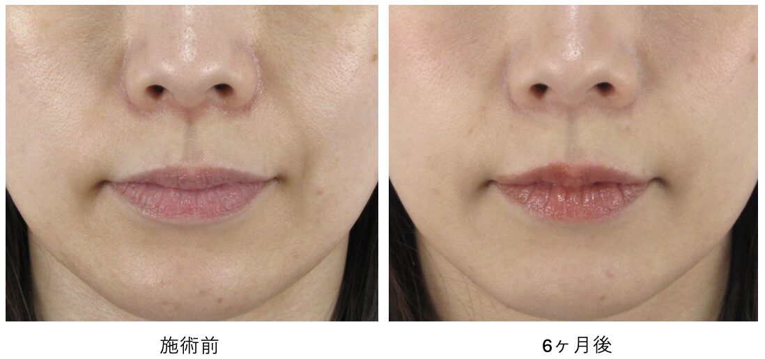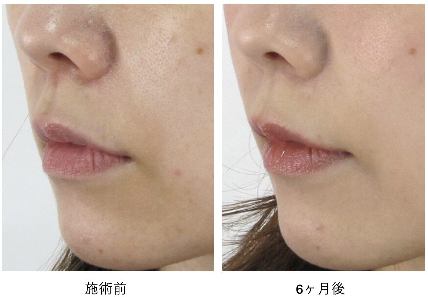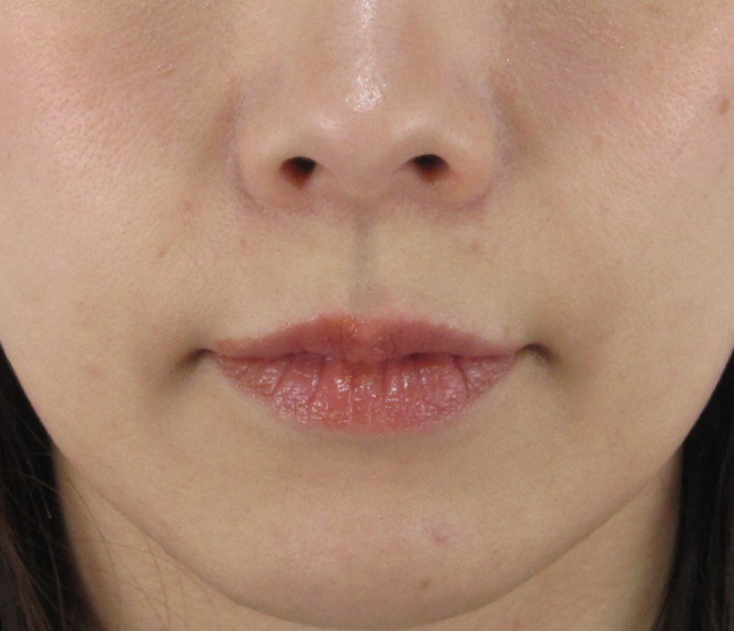 診察上、ほうれい線の構造上の「溝」はほとんど目立ちませんが、真顔のときにうっすらと浅いラインが出ているのがわかります。