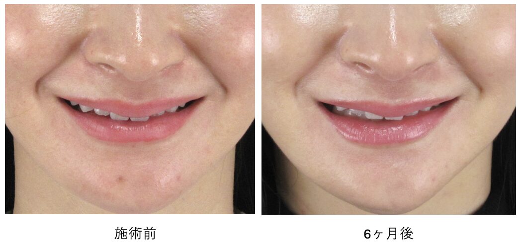 笑ったときも表情の動きや肌質に違和感はなく、ほうれい線の食い込みもやや浅くなり、将来的にも折れ癖が刻まれにくいしなやかな肌質に変化しているのがわかります。