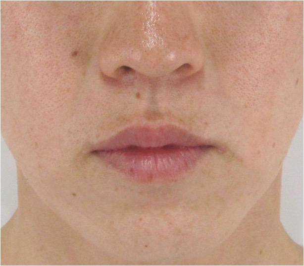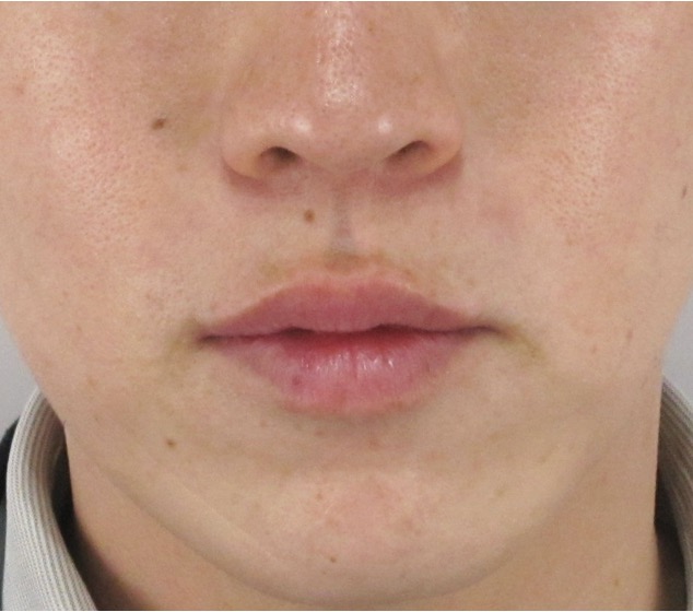 元のしわがないため一見わかりにくいですが、鼻の横〜ほうれい線起始部にかけてのわずかなくぼみが、徐々に改善してきている変化が見られます。