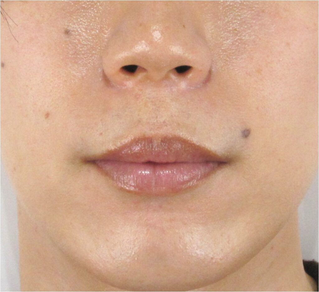 診察では、真顔の状態では構造的なほうれい線の溝はほとんど認められない状態であり、