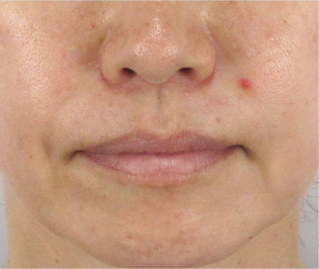ほうれい線の存在感がほぼ消失し、右口角下のえくぼのみがチャームポイントとして残っています。