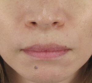 ほうれい線の溝自体はまだそれほど深くはないものの、笑ったときの表情筋の動きが大きく、真顔に戻してもその跡が残りやすい状態です。