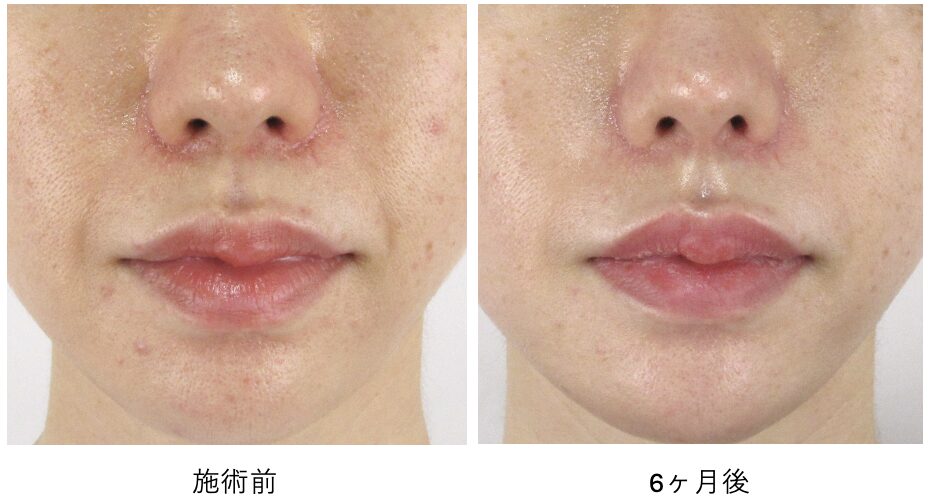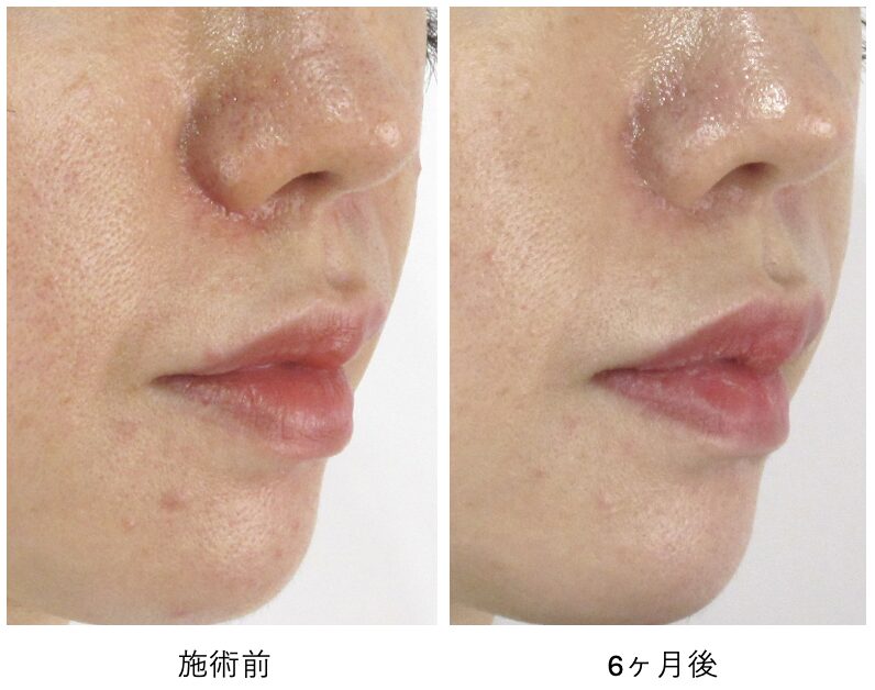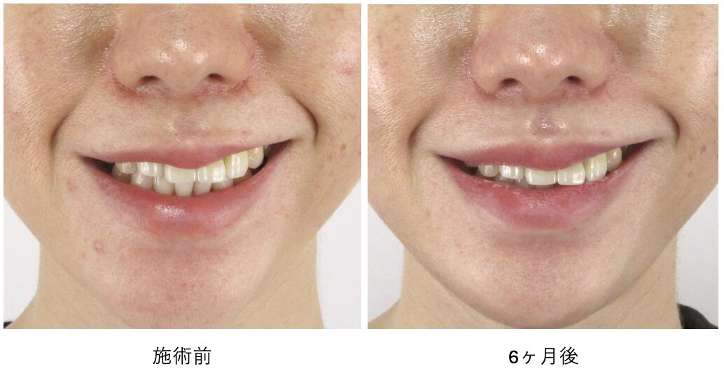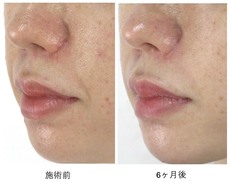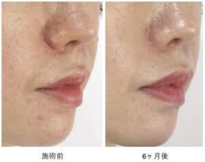 ほうれい線の溝そのものはもともと浅いため、真顔の状態での大きな変化は得にくいタイプですが、それでもほうれい線を下部を中心にうっすらと現れ始めていたラインが、浅く目立ちにくく改善しているのがわかります。