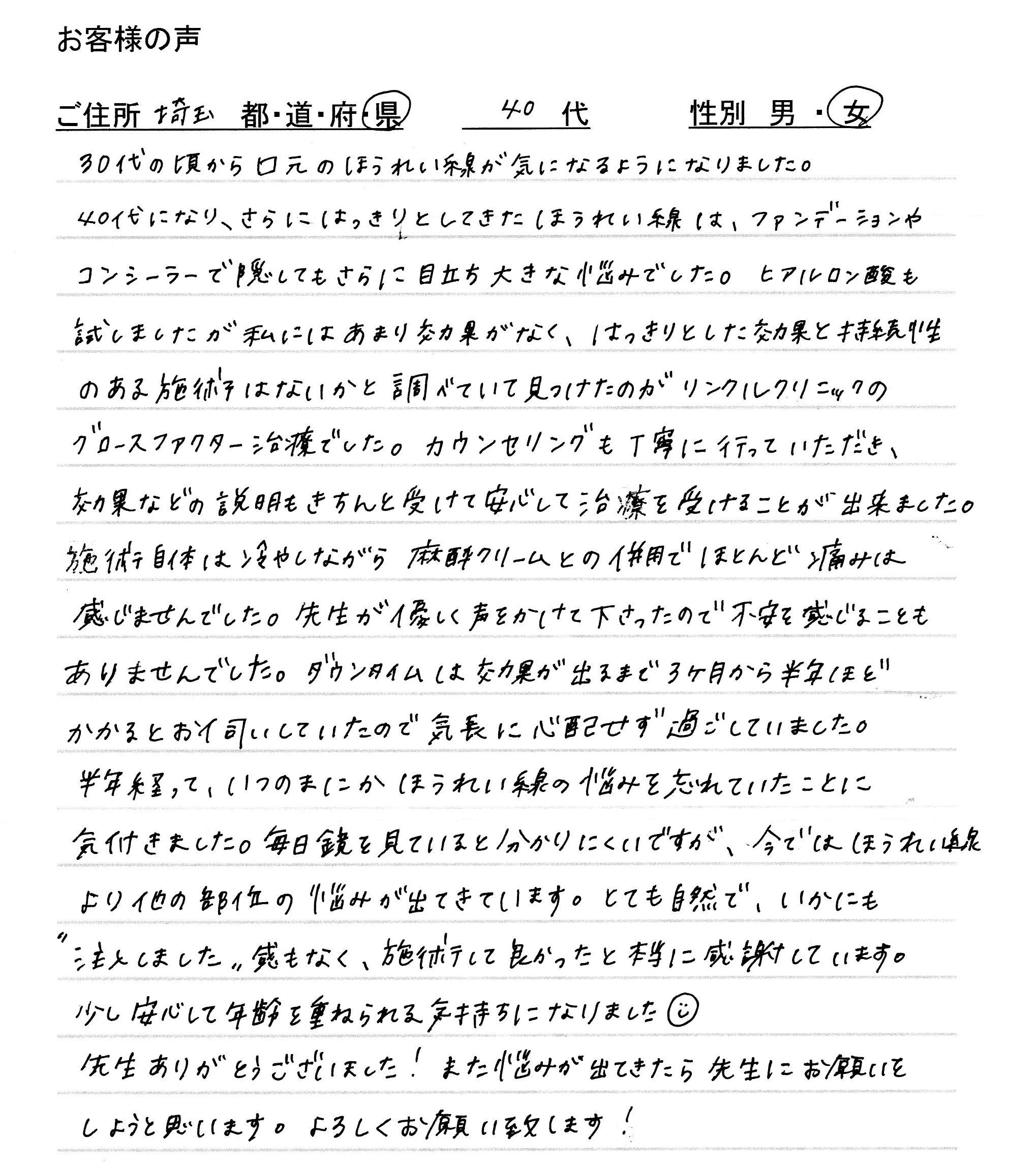 今回は、当院でほうれい線のグロースファクター治療を行った40代前半女性の症例をご紹介します。