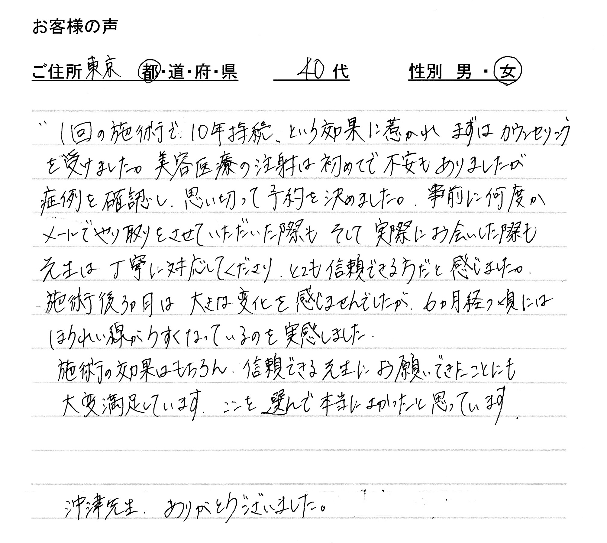 ご本人様も「とても良くなりました。ほうれい線が目立たなくなると今度は別の部位のしわが気になってきますね。」とおっしゃっており、効果を実感していただけて安心いたしました。