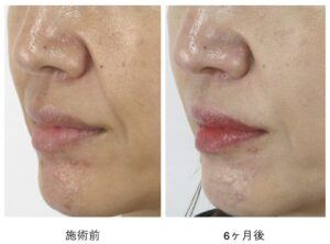 また、口角横のほうれい線の内側・外側には、皮膚のたるみが原因でみられる「膨らみ」がもとより存在しており、この膨らみに関しては施術後も変化せずそのまま残ります。