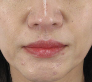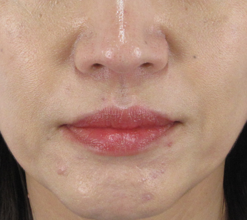 注射による点状の内出血がみられますが、腫れはほうれい線が浅く目立たなくなる程度のもので、ほとんど目立ちません。
