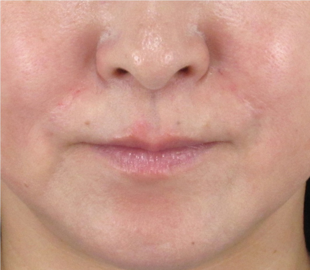 注射による点状の内出血と、麻酔クリームによる一時的な赤みが見られますが、腫れはほとんど目立ちません。