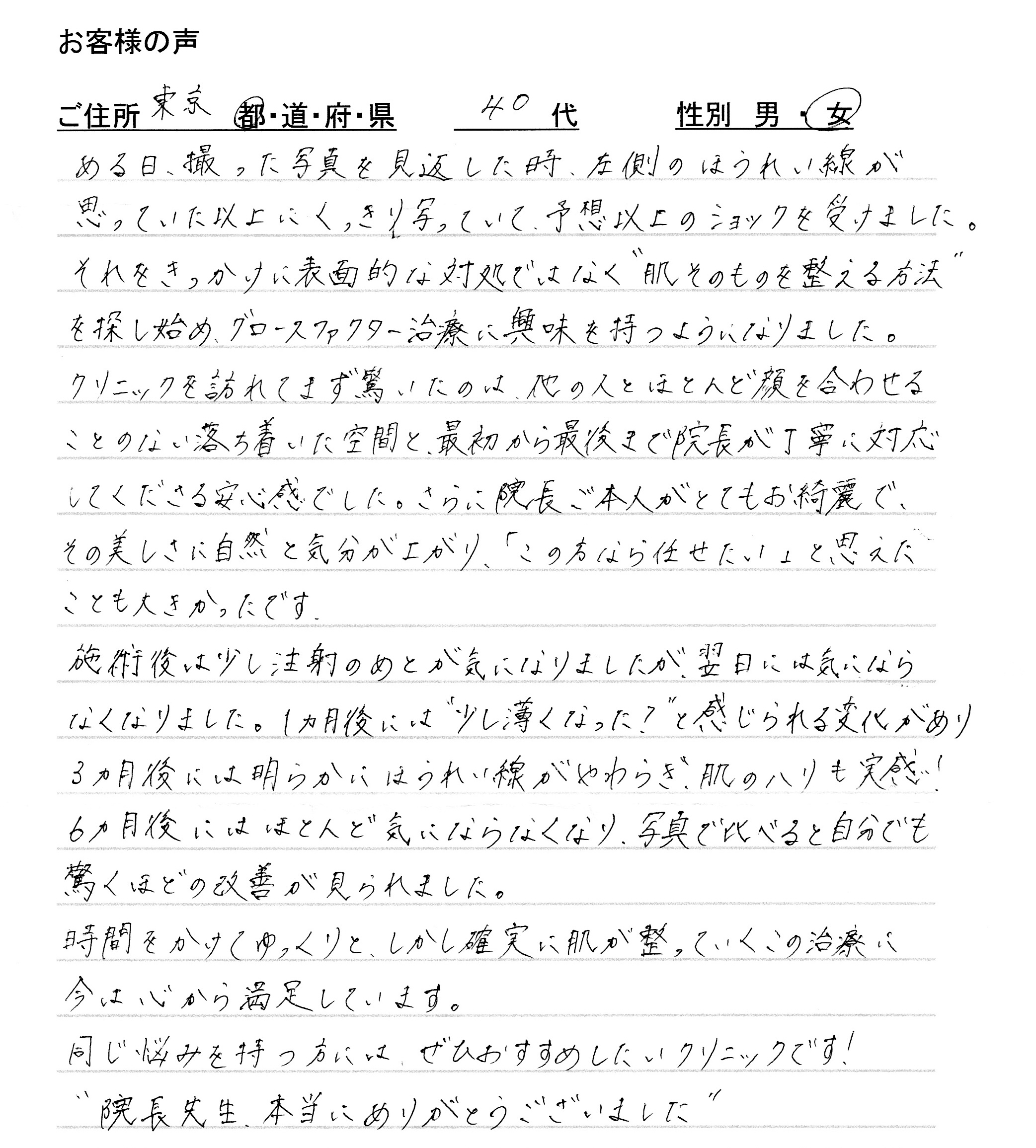 しかし、そこでお勧めされた「ヒアルロン酸注入」はくり返しの施術が必要となることに抵抗を感じ、悩んでいたさなか、長く効果が持続するグロースファクター治療の存在を知り、当院にいらしてくださいました。