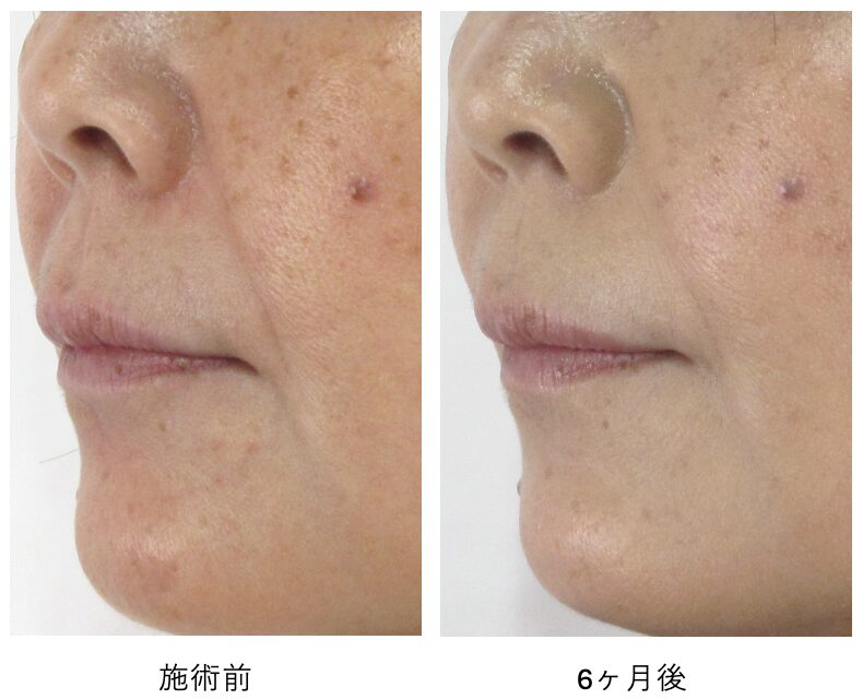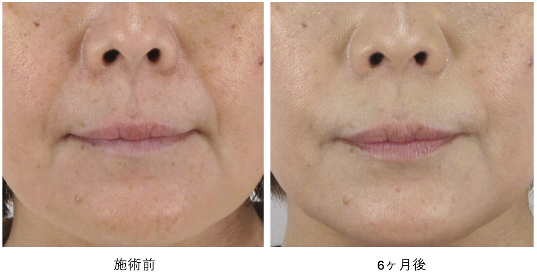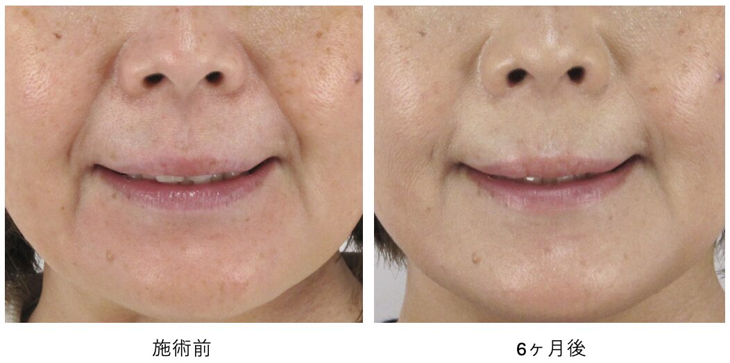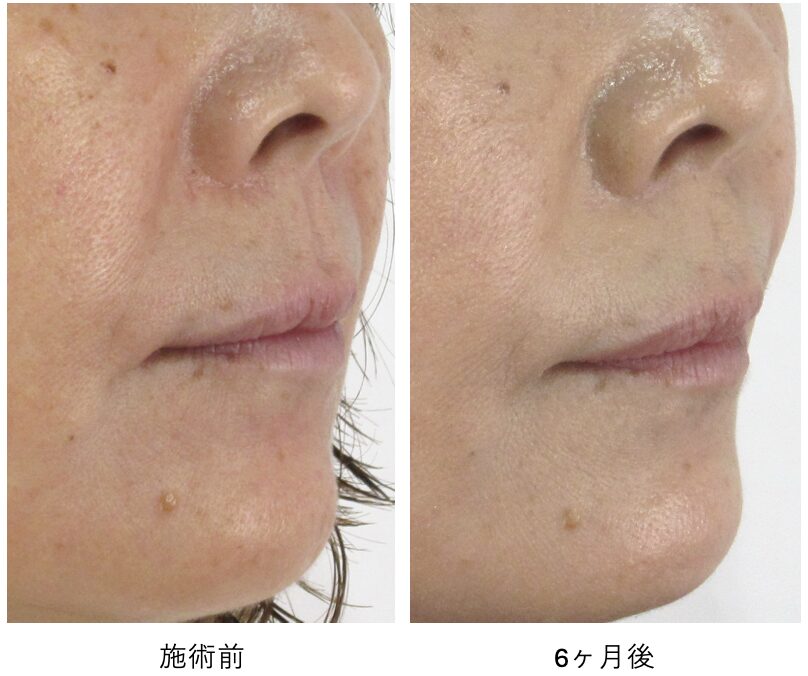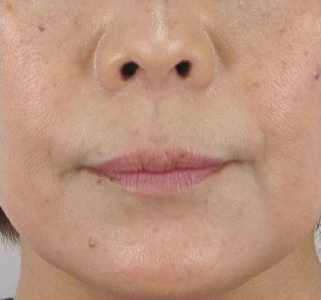 ほうれい線の溝が全体的に浅くなり、一部の折れ癖は残るものの、ほとんど存在感が消えました。