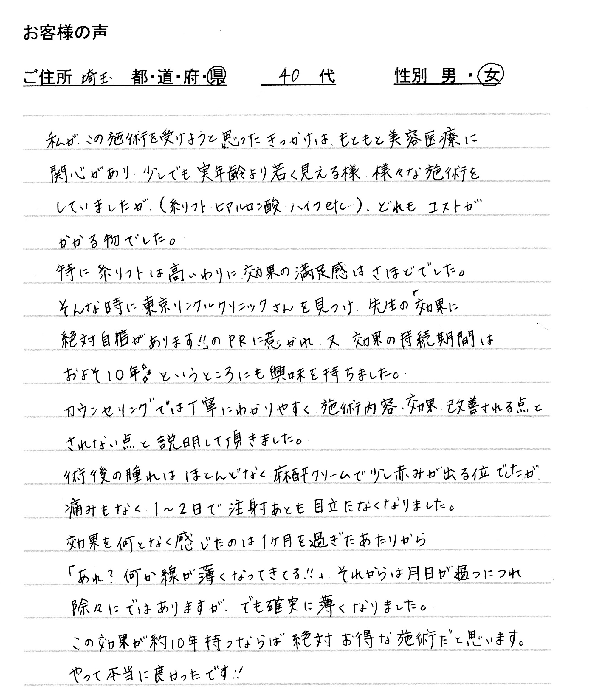 ご本人様からも「今までほうれい線とマリオネットラインが繋がって長く伸びて見えていたのがとても気になっていましたが、ほうれい線が消えることで何も気にならなくなりました。ヒアルロン酸のような人工物を入れるのではなく、自分の力で治っていくのもすごいと思いました。」と大変嬉しいお言葉をいただきました。