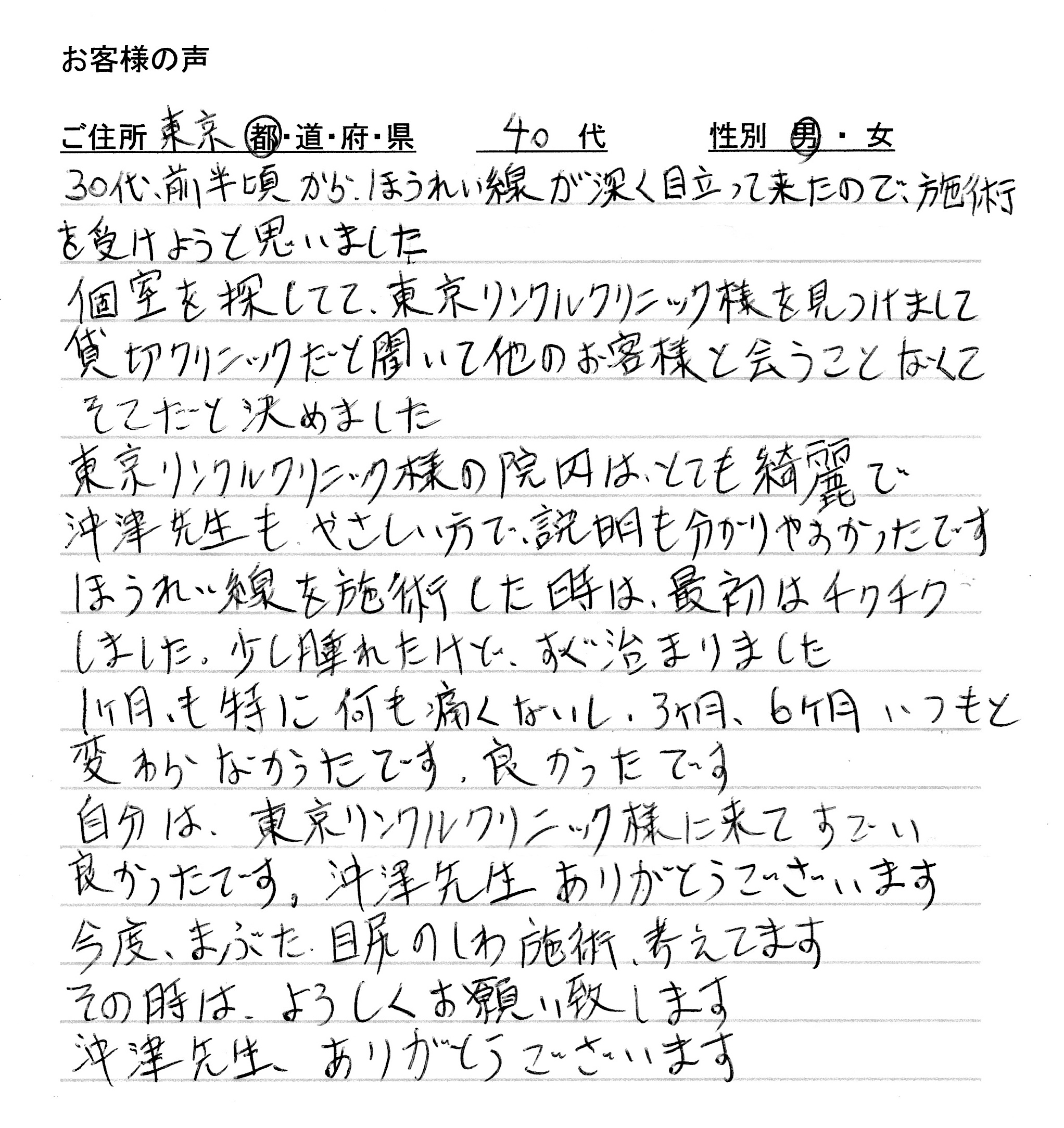 ご本人様からも「受けてよかったです。今度は他の部位のしわも治したくなりますね。」と嬉しそうにおっしゃっていて何よりでした。