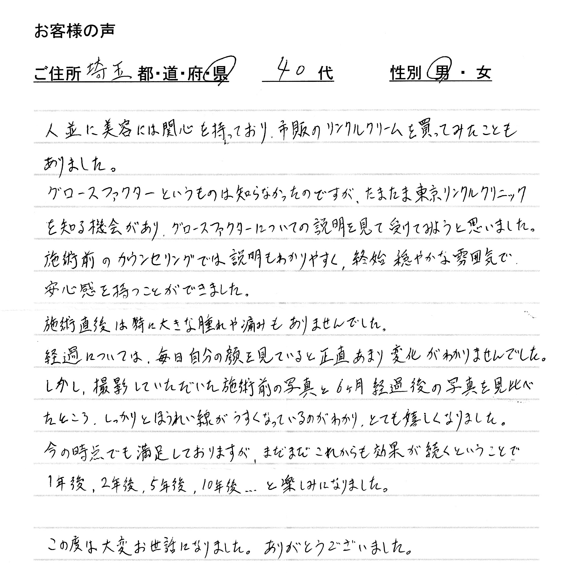 現状に特別なお悩みがあるというわけではないものの、数年前からなんとなくほうれい線の存在感が出てきたことに気づいていたようで、将来的な「老化の予防」につながるグロースファクターの存在を知り、当院での治療を決められました。