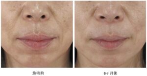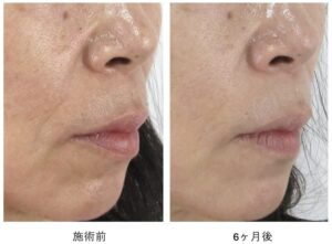 また、口元の皮膚のたるみがほうれい線にぶつかってたまることによる「ほうれい線内側の膨らみ」がもとより存在し、この膨らみに関しては施術後も残ります。