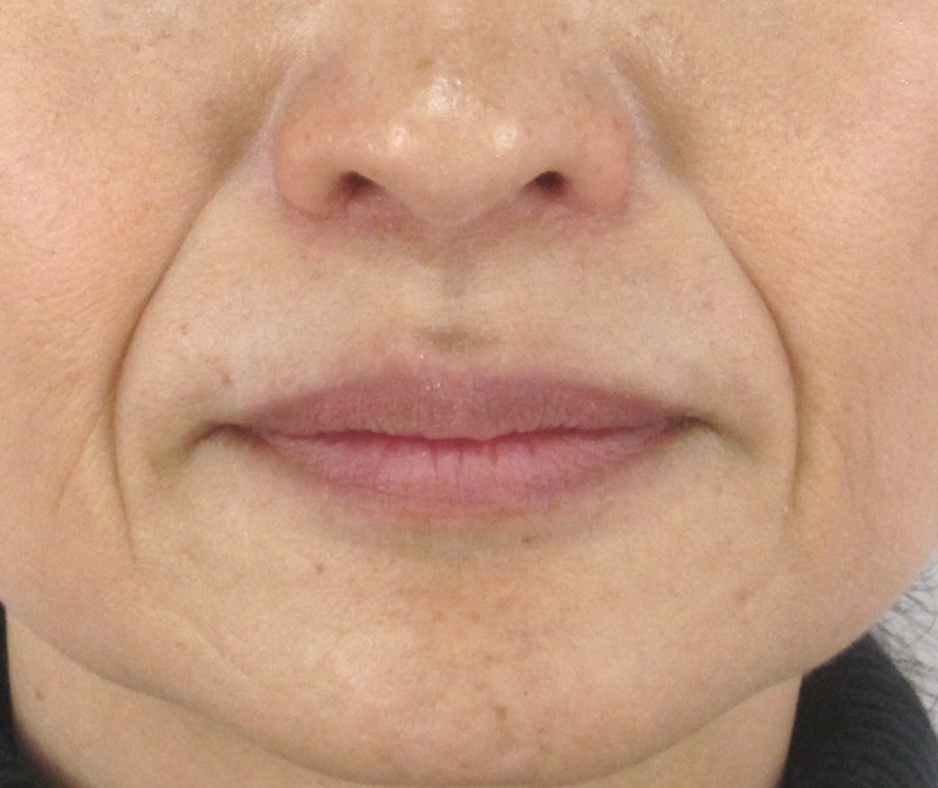 診察では、ほうれい線の溝が比較的深く、皮膚表面には折れ癖がはっきりと刻まれている状態でした。