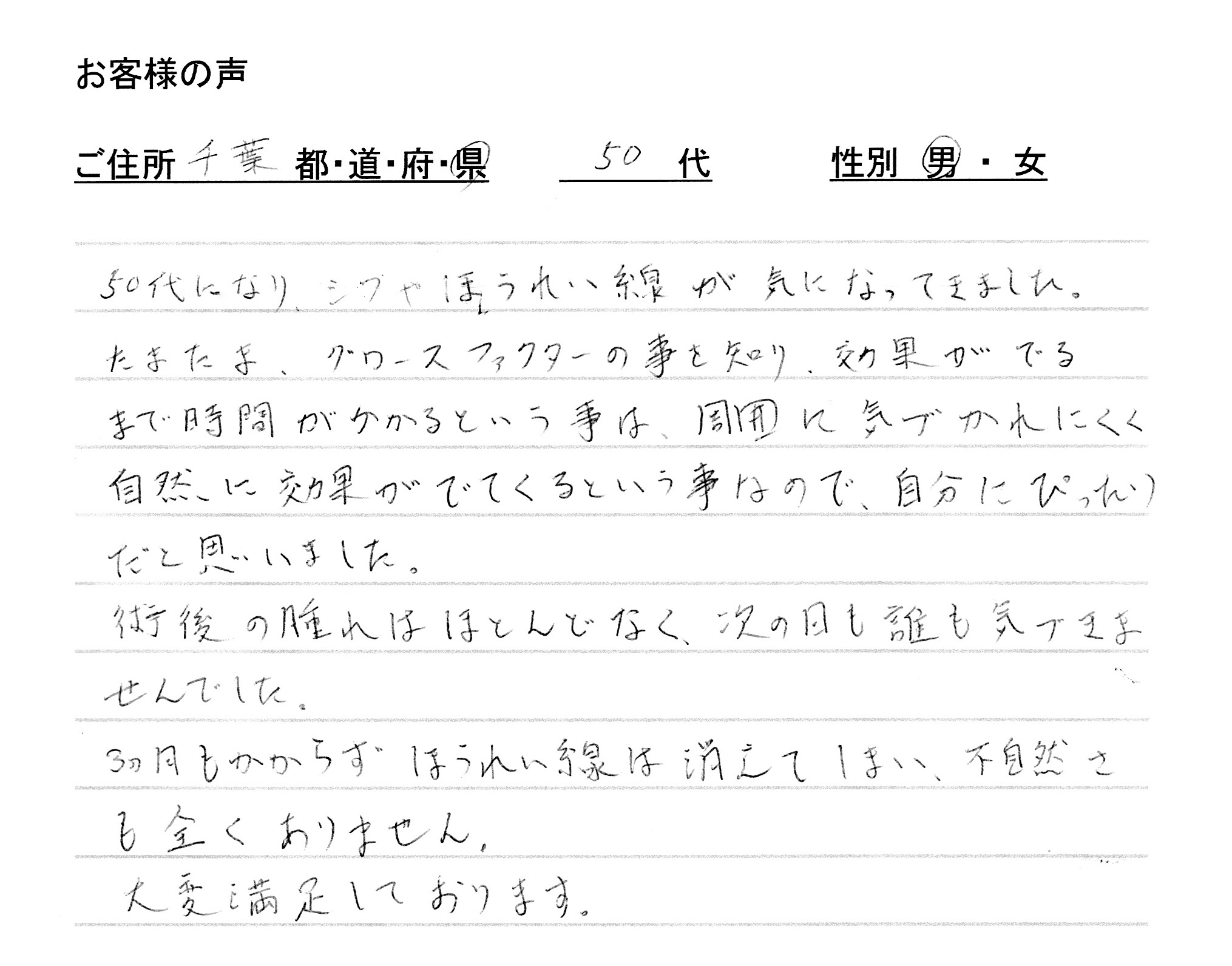 ご本人様も「今ではもう何も気にならなくなった。ほうれい線が消えたので、今度は他のしわも治したいですね。」