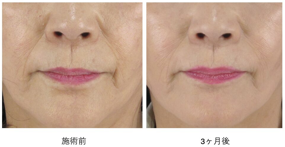 折れ癖はわずかに残るものの、肌のハリが向上し、ほうれい線全体のの溝が底上げされている変化がみられます。