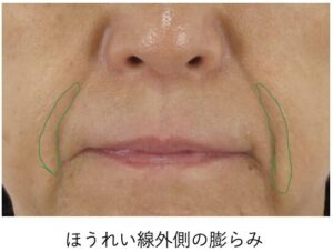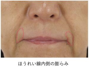 さらに、ほうれい線の両側(外側・内側)には、皮膚のたるみが原因でみられる「膨らみ」が元より存在しています。