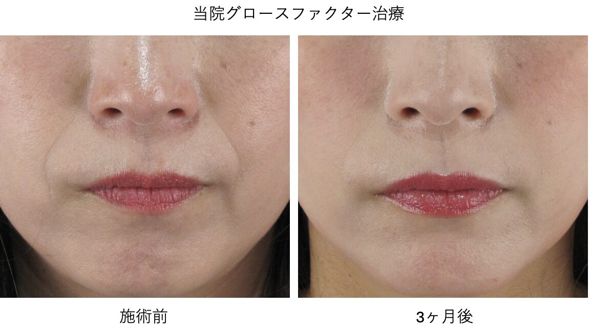 グロースファクター(成長因子)をほうれい線に直接注射することで、皮膚の真皮層のコラーゲンやエラスチンの再生が促され、しわが根本から浅く目立たなく改善する治療法です。