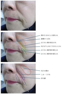 ほうれい線周囲の毛穴やくすみなども重要な判断材料です。